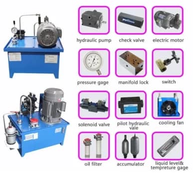 یونیت هیدرولیک از پمپ هیدرولیک، الکتروموتور، مخزن روغن، فیلتر، شیرهای کنترل فشار و جریان، مبدل حرارتی، مانومتر و اتصالات تشکیل شده است. این اجزا با هم وظیفه تأمین، کنترل و انتقال قدرت هیدرولیک را برعهده دارند.