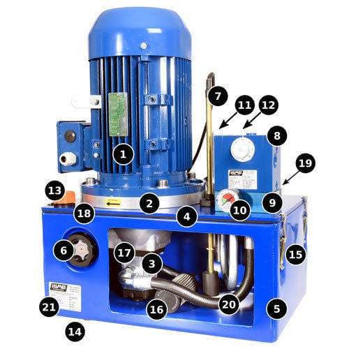 یونیت هیدرولیک از چند بخش اصلی تشکیل شده که هرکدام نقش مشخصی در تولید، هدایت و کنترل روغن هیدرولیک دارند. این اجزا شامل مخزن روغن، پمپ هیدرولیک، الکتروموتور، شیرهای کنترلی، فیلتر، گیج فشار، کوپلینگ و گلدانی هستند.